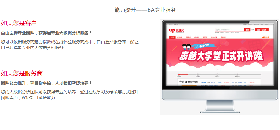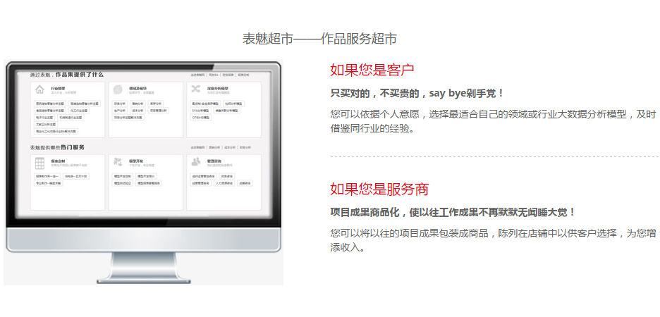 随着互联网时代的快速发展,企业正在打破传统运营管理模式,逐步向”数据驱动企业“转变,在这种背景下表魅网应运而生,作为基于用友BA的运营云平台,既能为客户提供快捷、专业的数据分析服务,又能为服务商创造商机和提升数据分析能力,最终达到客户与服务商共赢的效果。